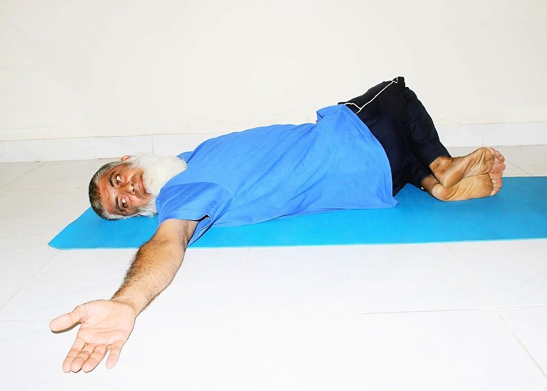 1. Lie down straight and spread both the hands at the shoulder level . the palms should be open, facing the sky, fold both the legs at the knees and keep them near the hips.