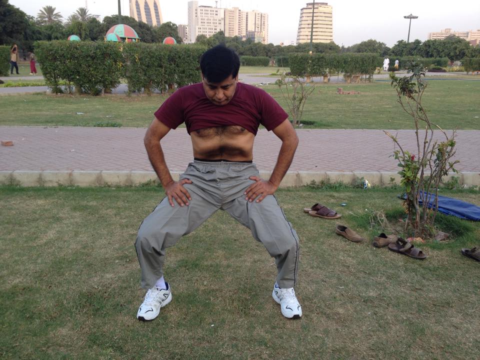 Stand up keeping a distance of one to one and a half foot between the feet, with the hands on the knees, press the knees with the hands. Look at the ground. Exhale fully and pull the stomach inwards to such an extent that the stomach touches the back. Then push the stomach out. Repeat this exercise according to your capacity. This will soften the stomach and help in doing nouli process.