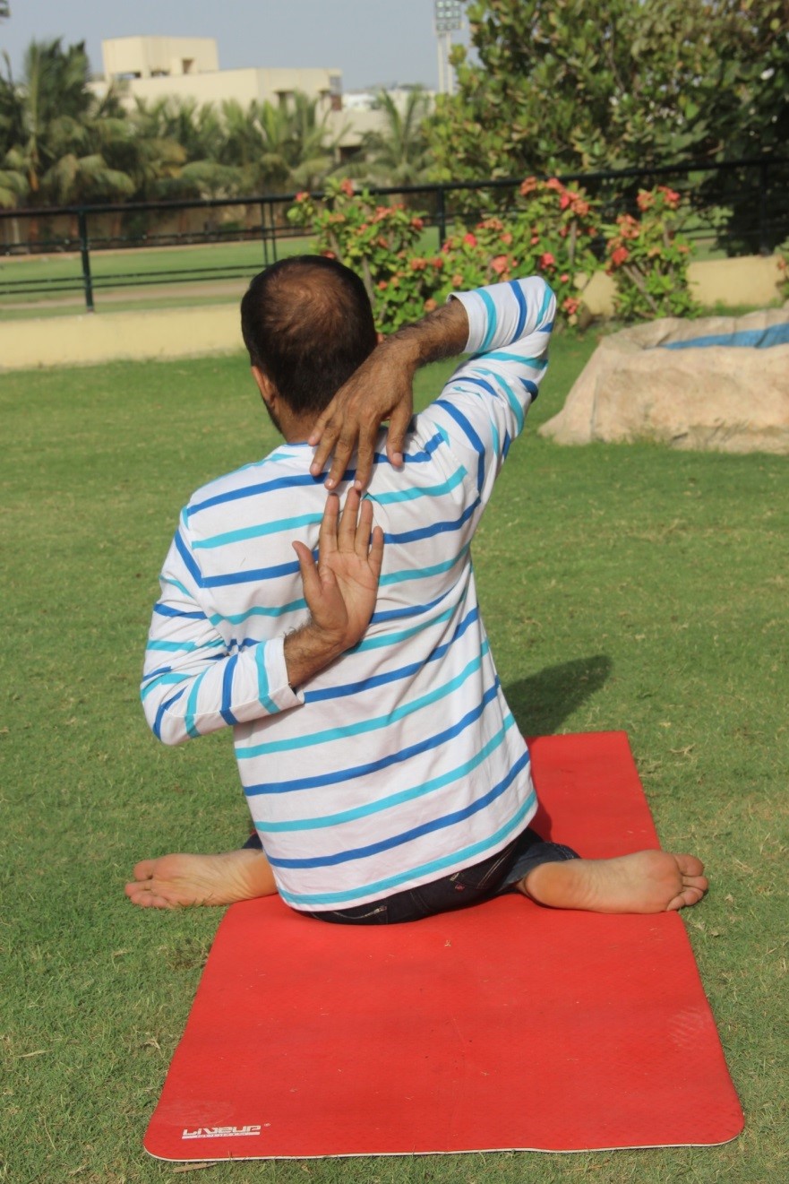 4. Then fold the left hand from the elbow and raise the left forearm behind the lower back (See the Pic).