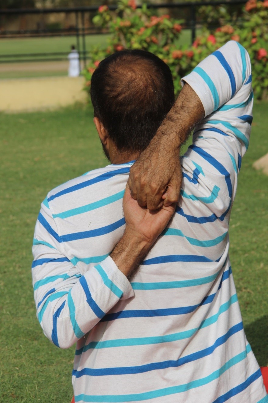 3. Raise the right arm over the head, bend it at the elbow and keep downwards on the upperback.