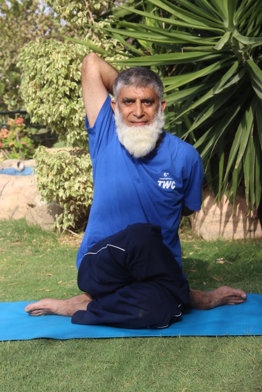 7. Unclasp the hands and repeat the posture on other side for same duration.)