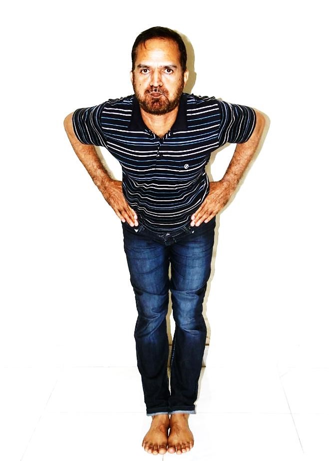2. Then take deep breath (inhale) through nose and then breathe out (exhale) through mouth slowly by bending forward.