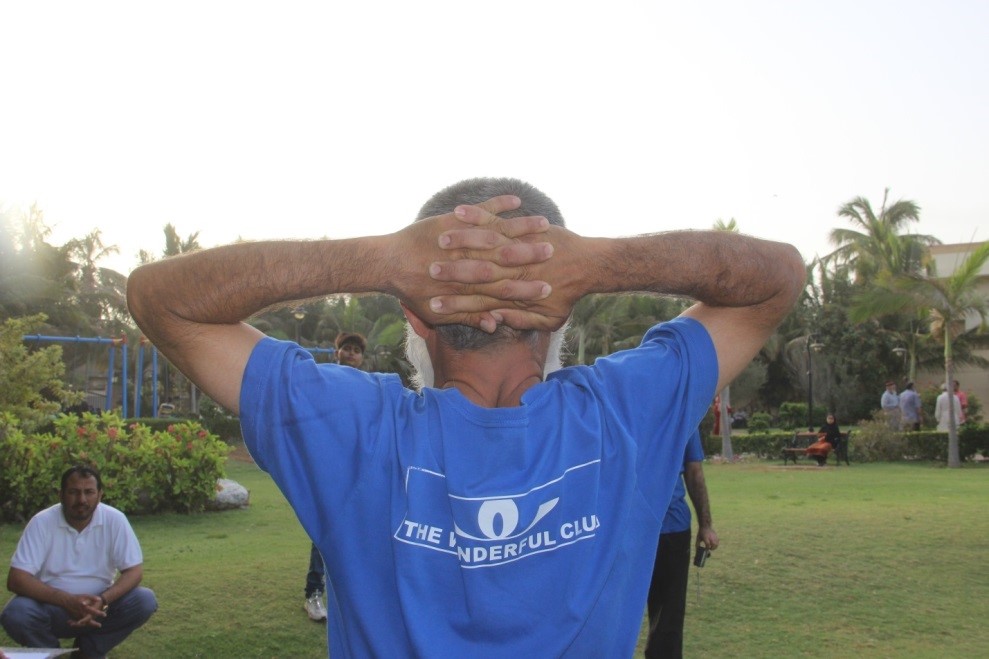 Stand straight. Interlock your fingers of both hands at the back side of your head. Now bring the elbows together in front. Do this for 10 times.